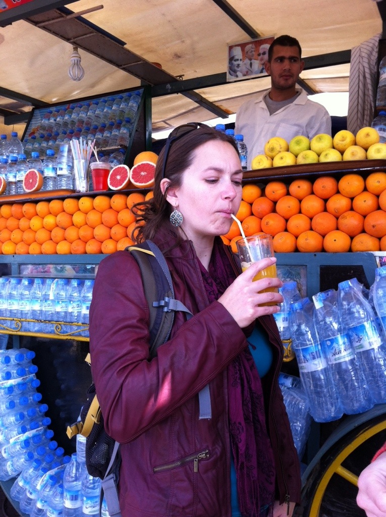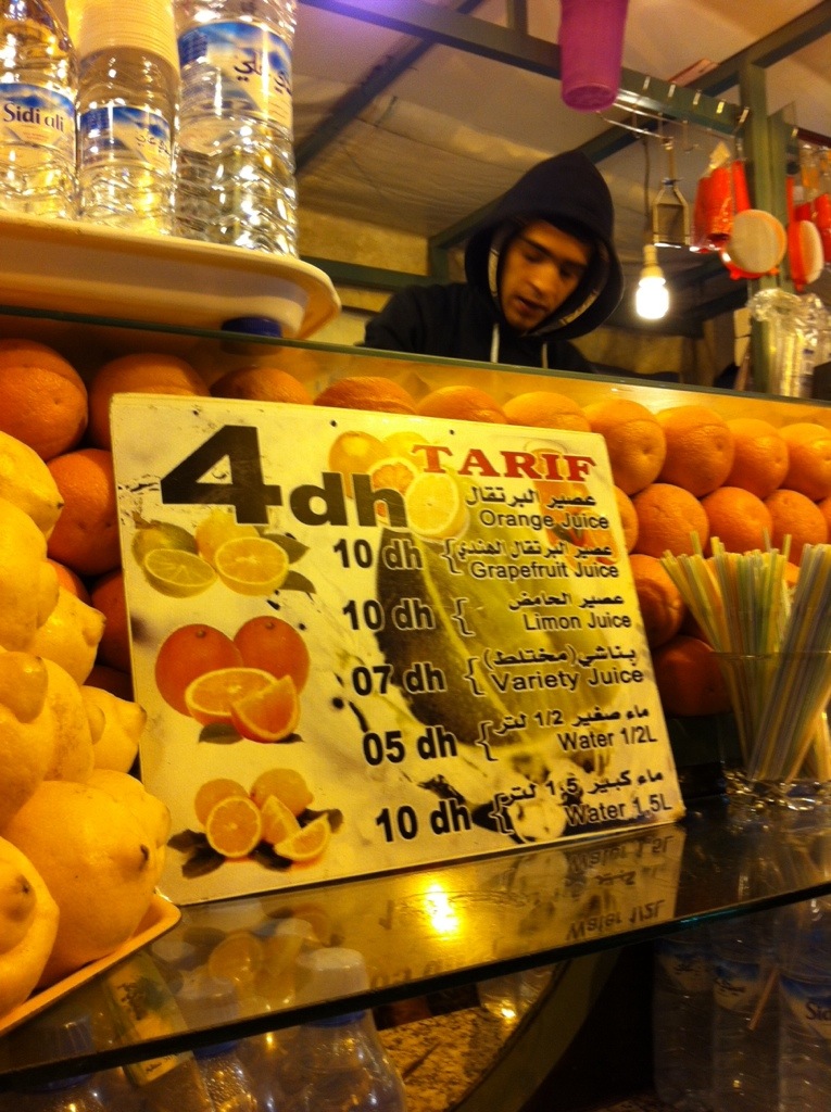 Freshly squeezed orange juice. I repeat, freshly squeezed orange juice. Almost everyone reading this knows I hail from Florida, where I could pick oranges off any trees I could reach the bottom of. But I moved to Europe where orange juice is not only a made-from-concentrate luxury, it’s an expensive made-from-concentrate luxury! Seriously, for a 0.2 liter cup of OJ, you can pay more than 3 Euros. In the Marrakech market, there were infinite numbers of OJ vendors, selling massive glasses for 4 Dirhams (less than 40 cents)!