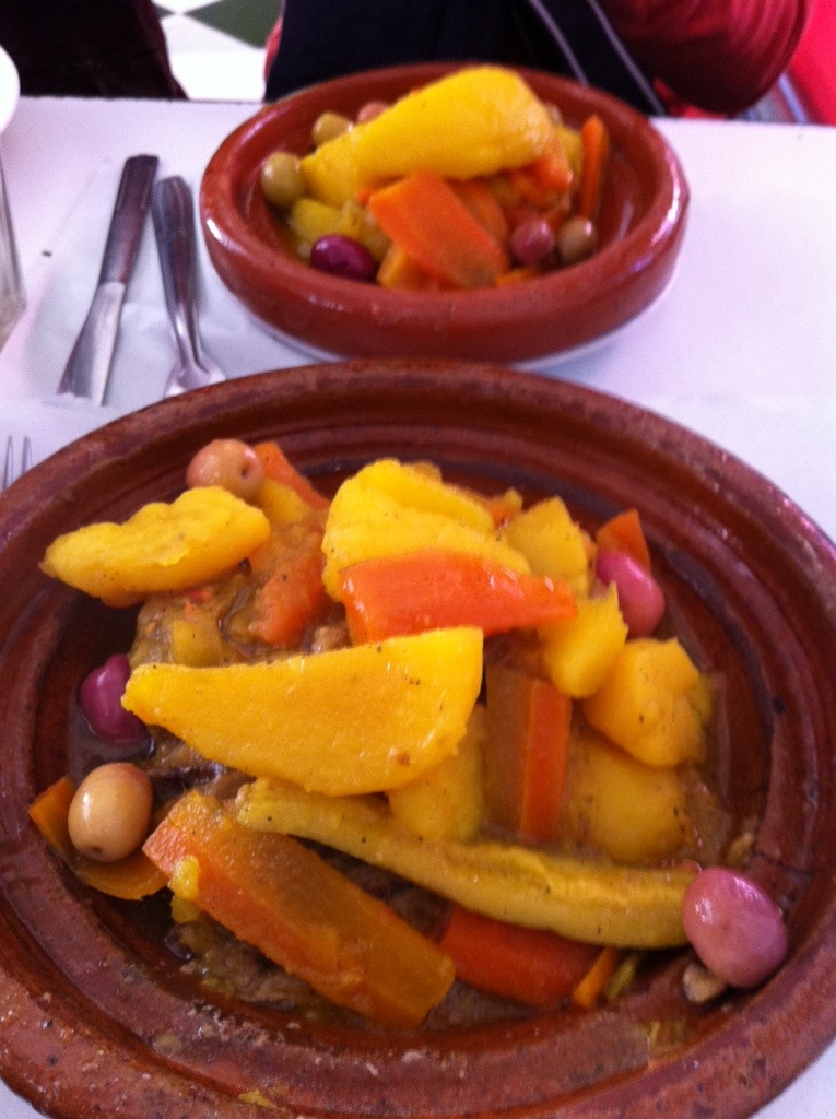 Tajine (in Arabic: طاجين-) – according to Wikipedia it’s a historically Berber dish from North Africa named after the type of pot in which it’s cooked, traditionally over coals. We ate vegetable, chicken, and meat tajines (they ended up being very stew-like), and I don’t know that I can pick a favorite! These ran between 25 and 40 Dirhams per meal (and they were so filling, too). Yum!