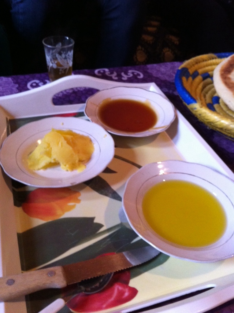 While taking a tour of a Berber house on the outskirts of Marrakech, we got to try homemade bread and dips for breakfast while sipping on mint tea and hearing about the history of the area. These dips, you guys, were bottle worthy. I want that honey!
