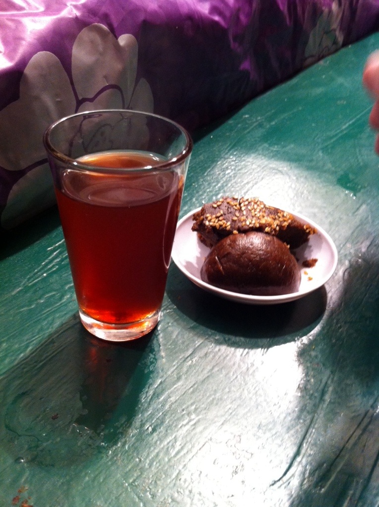 On our last night in Marrakech, we also found a market booth that sold spiced tea for 3 Dirhams. What kind of spices, you ask? Spicy ones, I found out the hard way. (These include cinnamon, galangal, ginger, cloves, cardamom, nutmeg, and star anise.) It was delicious, but my throat was not happy with my choice to consume the entire glass. With the spiced tea, we got some kind of chocolate thingamabob for 7 Dirhams (I can only assume to deaden the pain from the tea). I truly don’t know what it was, but it wasn’t too sweet and had a very rich, grainy consistency.