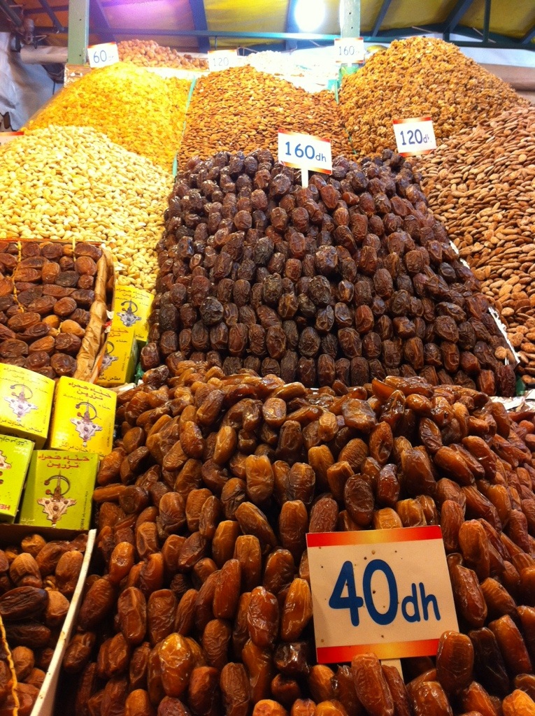 Fruits, nuts, and bite-sized sweets galore! We consumed copious amounts of clementines, some kind of caramelized peanut treat, and tiny sweets that you could buy a box of for 30 Dirham! ((This was not a small box, either.) In the market, you could also purchase a really dense Moroccan bread roll for 1 Dirham to sustain you in case the other food didn’t fill you up. =)